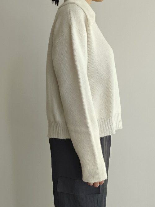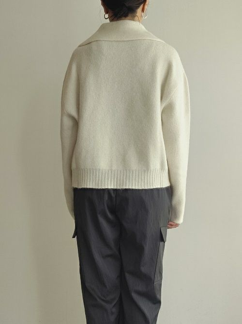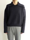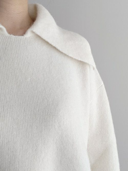 大きな襟が特徴的で、洒落感と愛らしさがあふれるニット。トレンドのビッグシルエットで、着丈はショートになっています。