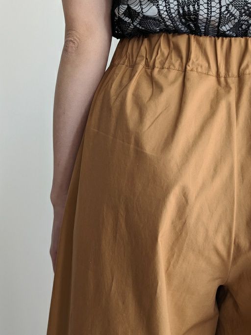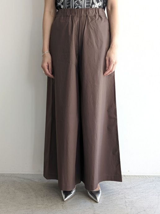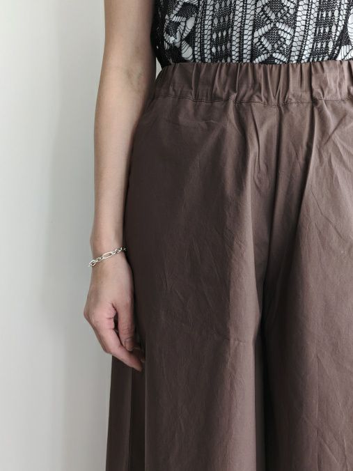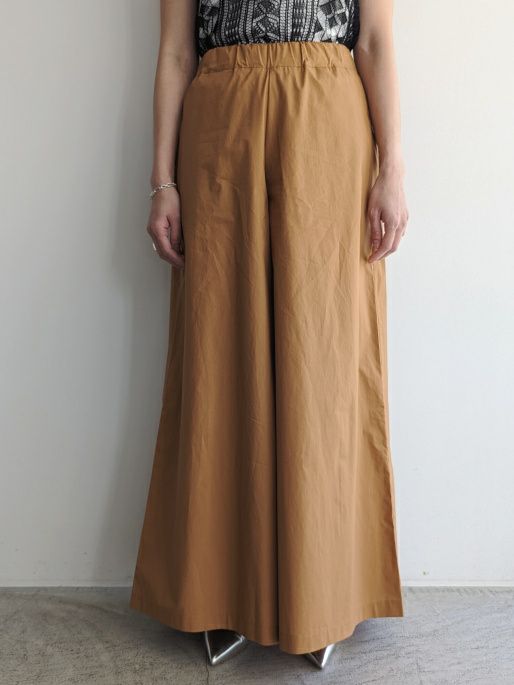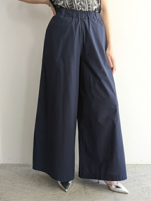 軽やかでフレアスカートのような広がりが女性らしいワイドパンツ。上質なコットンを使用しているので肌当たりも柔らかで、ウエストはゴム仕様で余計なものがなく、洗練されたシンプルなデザインです。ロベルトコリーナのニットとも相性抜群です。