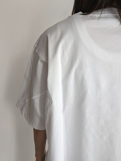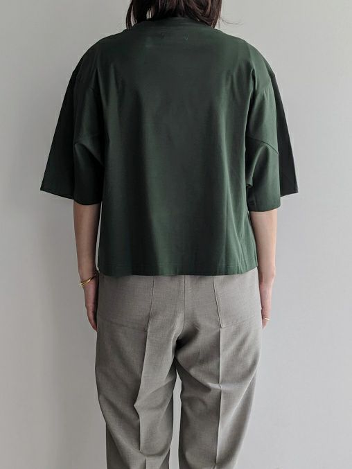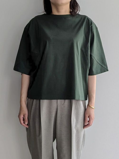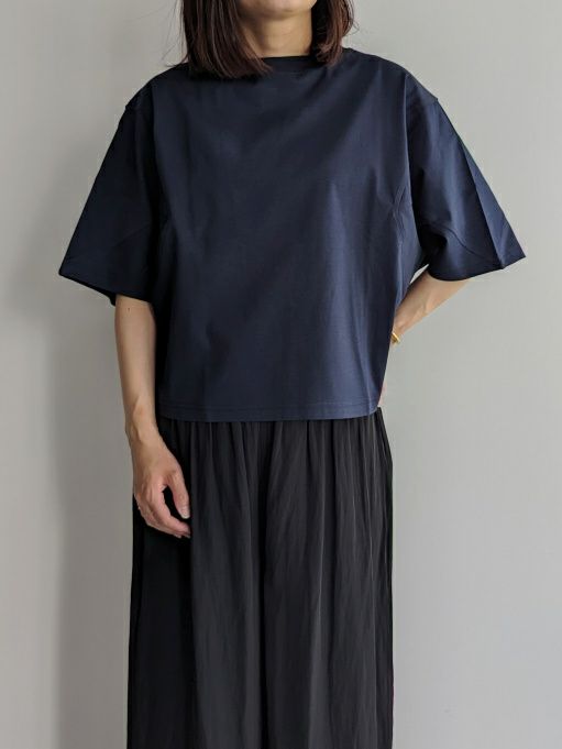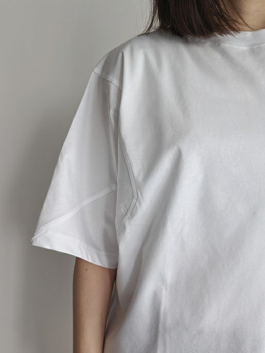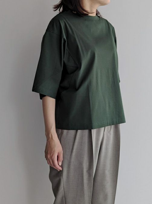 紡績過程で短い繊維を取り除き、繊細な綿糸を使用したTシャツ。糸の段階でマーセライズ加工を施しており、シルクに近い質感を実現しています。