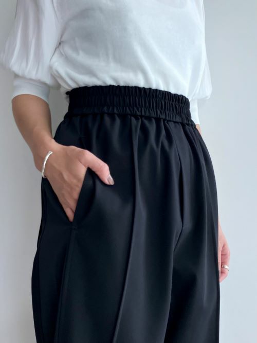 サステナブルなセルロース系合成繊維を使用したパンツ。ストレッチ性のあるジャージー素材でありながら、滑らかさと程よい光沢感を兼ね備えています。適度なハリ感もあるため、ラグジュアリーな雰囲気も◎。