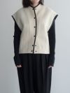 フェイクレザーパイピングで縁取ったシンプルなショートベストは、カットソーにオンする秋口のプラスワンアイテムになります。冬にはアウターのインナーとしての着用もお薦め。