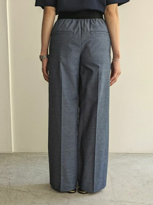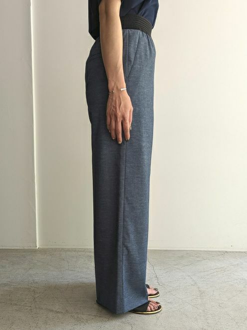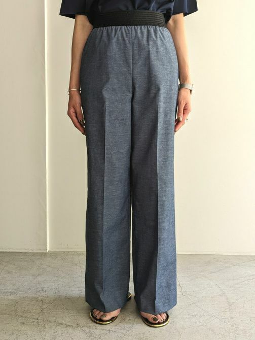 肌触りが良く涼やかなパンツ。程よい太さなので合わせるアイテムを選ばずにマルチに活躍するアイテムです。ウエストのバンドがアクセントになるので、トップスインのスタイリングもおすすめです。