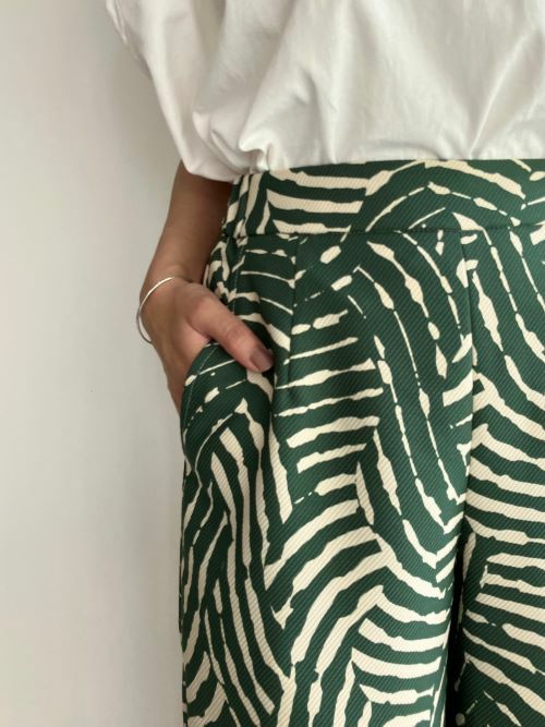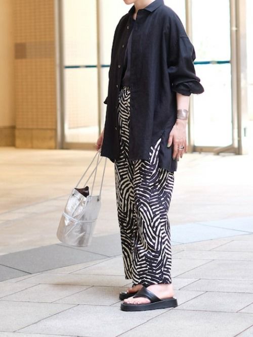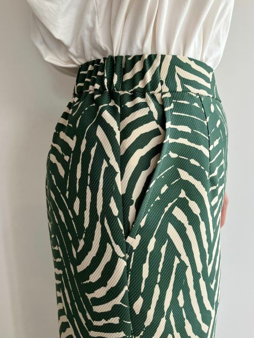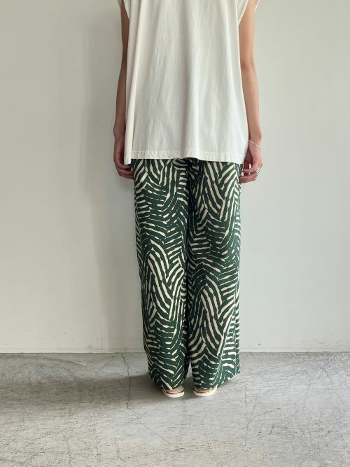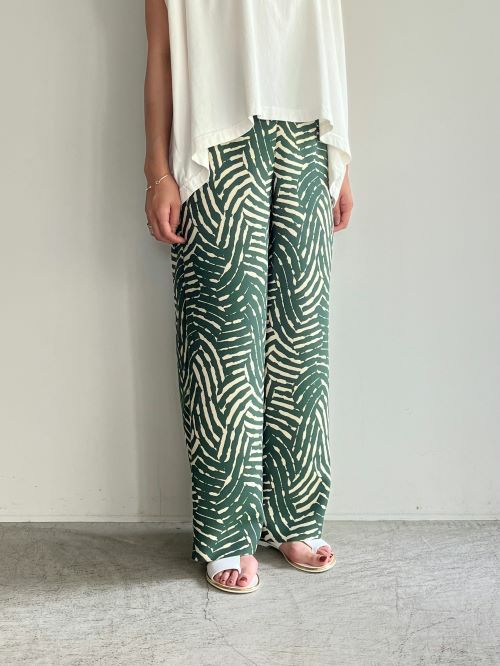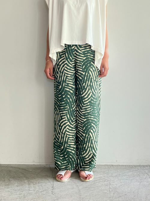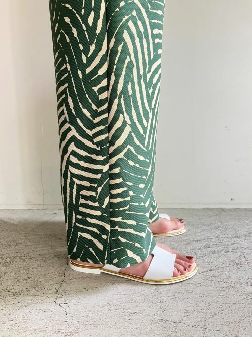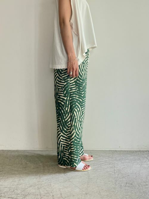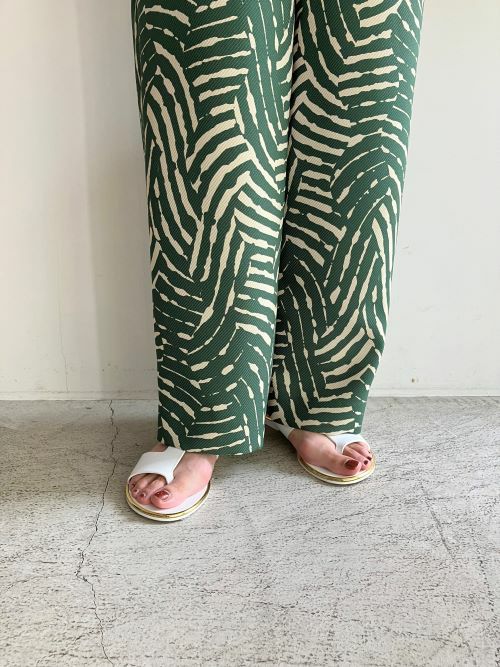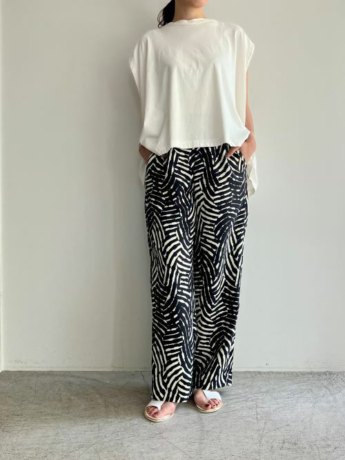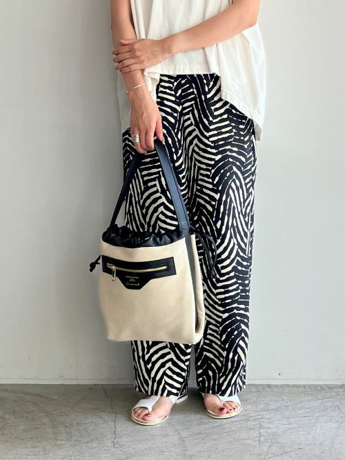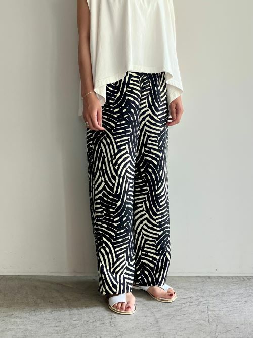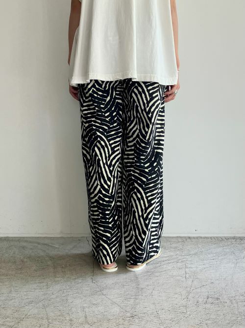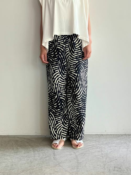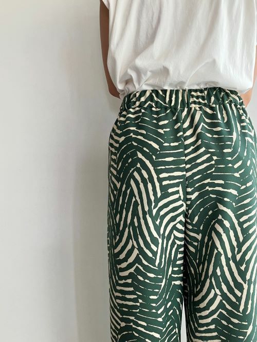 ややゆとりのあるストレートシルエットで脚のラインを拾いにくく程よいリラックス感のあるパンツ。凹凸のある生地にランダムな動きのあるストライプの重なりが立体感を醸し出してくれます。ウエストは前きちんと感があるデザインにして後ろはリラックス感が出るようにゴム仕様になっています。裏地はありませんが柄がしっかりしているので、移りなどもきになりません。