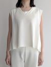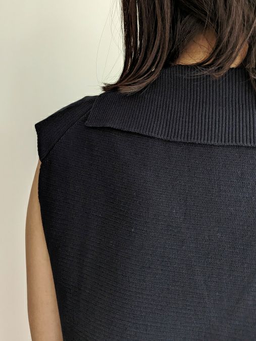 軽く柔らかく非常に着心地の良い糸を使用した、ミラノリブのノースリーブです。小さめのセーラーカラーがクリーンな印象で、きちんと見えるのに楽ちんで、構築的なフォルムとミニマルなデザインがとても洗練されています。上質なBCIコットンと膨らみのあるブライトポリエステルを複合した糸は上品な光沢があり、編地が非常に美しく形状安定も優れているのが特徴です。ご自宅での手洗いは可能です。