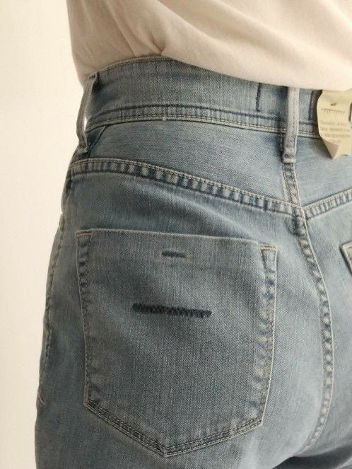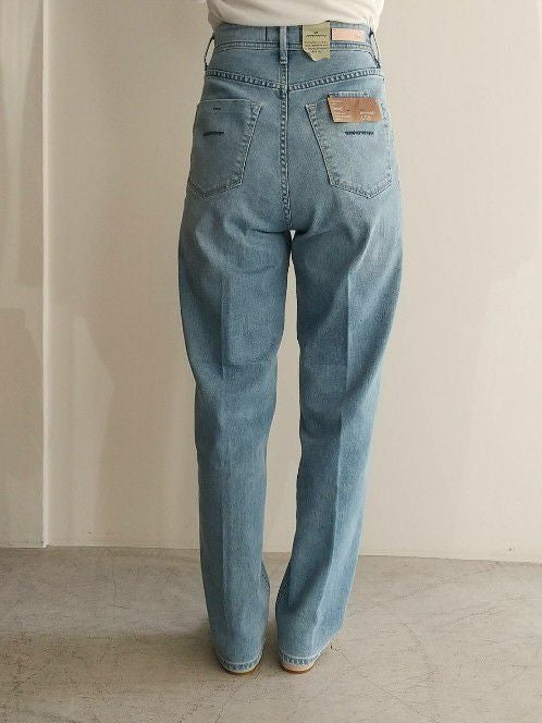 リアリーライトデニムLEAはセンタープレスが入ることで、足の甲に引っかかりづらく、ストンと綺麗なストレートになります。夏におすすめの爽やかなライトブルーで、淡色ですがしっかりスリを入れることでYANUKらしいキレイな印象です。ナノミスト加工という、従来のデニム加工よりも水の使用量を削減でき、環境にも優しい加工を施しています。