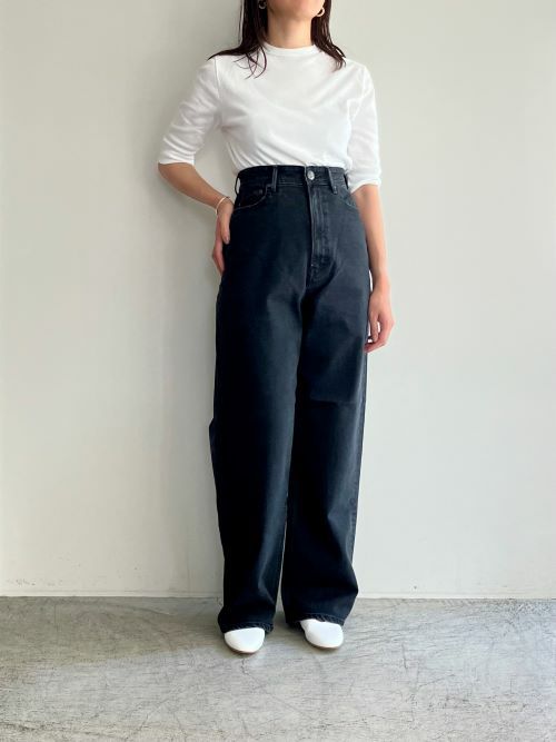 フラットな印象になりやすいカラーパンツとは違い、ブラックデニムに加工感を施すことで、デニムならではのアタリ感が生まれ、のぺっとした印象にならないブラックジーンズです。通常、ブラックデニムは黒のタテ糸×白のヨコ糸で織られているモノが多いので、加工するとコントラストが付きすぎてしまい、カジュアルな印象に仕上がりがちですが、この品番は黒のタテ糸×黒のヨコ糸で織られたブラックデニムを使用しているので、いい意味で加工感が付きすぎない、上品な印象のブラックデニムに仕上がりっています。カジュアルからキレイめまで、様々なコーディネートに合わせやすい1本です。
