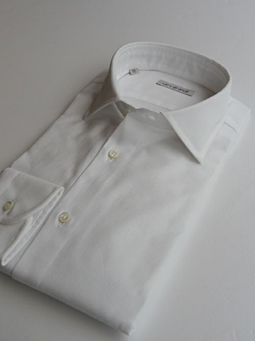 オックスフォードとメッシュ生地の間ほどの絶妙な生地感で、オールシーズン着用出来る折柄のドレスシャツです。小ぶりのワイドカラーが美しく、ノーネクタイでも襟が崩れることなく収まりの良い仕上がりです。