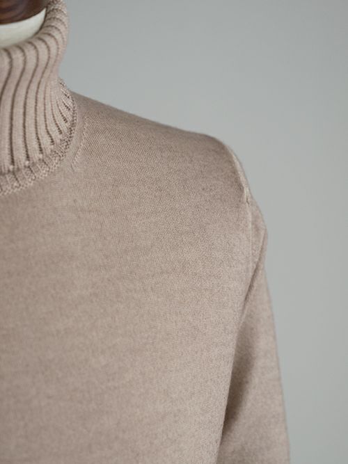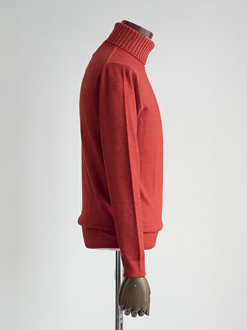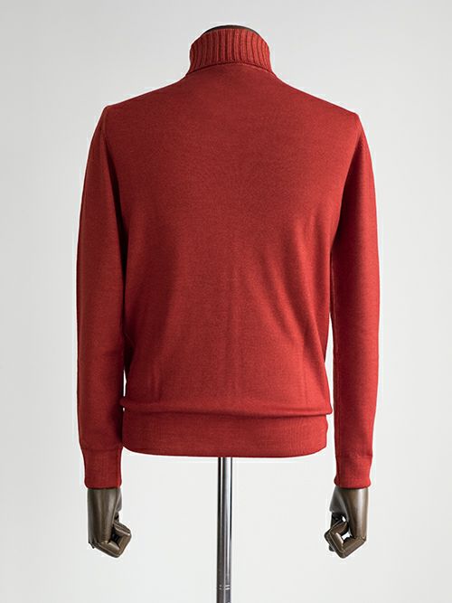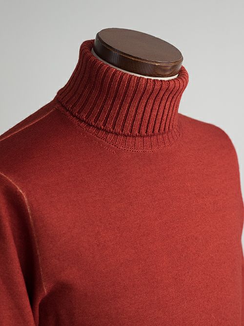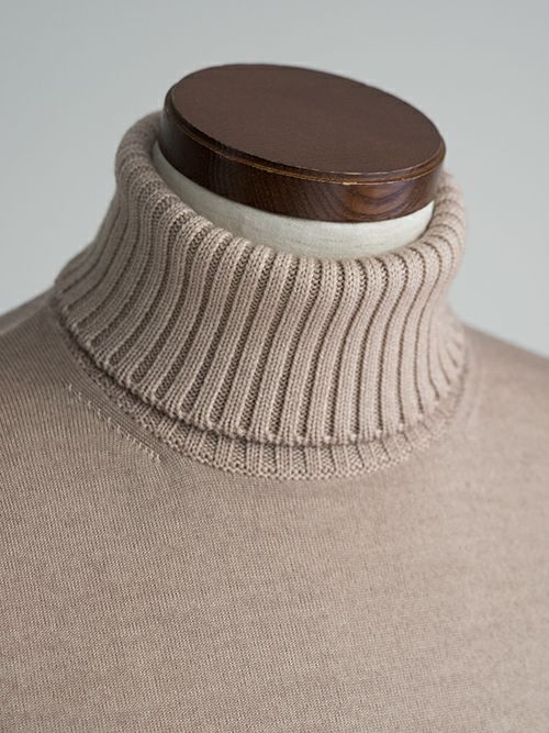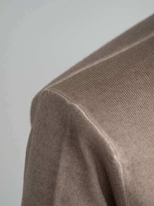 首回りのリブを9ゲージのミドルゲージの糸を使用し、少しカジュアル感をもたせた仕上がりです。ジャケットなどのインナーとしてのフィット感や動きやすさはもちろん、一枚で着用した際にも、しっかりと存在感のある適度な厚みが魅力的な汎用性の高い一着。