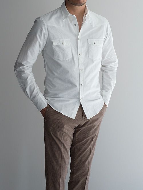 オックスフォード生地のウエスタンシャツ。襟型がナローショートでカジュアルに寄りすぎない上品な仕上がりです。