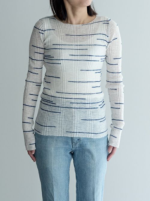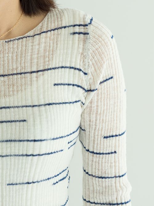 少しタイトめで伸縮性があるリブニット。リネンとポリエステルの柔らかな素材で肌あたりも良く絶妙な透け感も涼しげに見えます。身体に沿うシルエットでボトムにインして頂いても女性らしい印象になります。