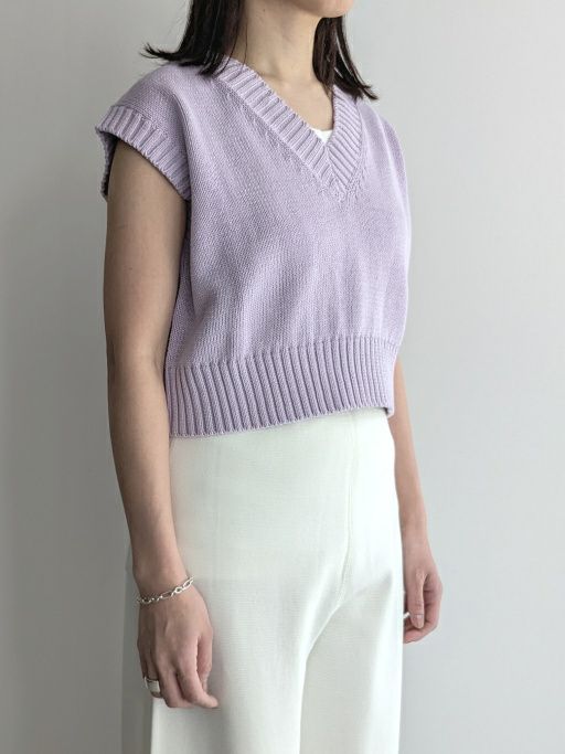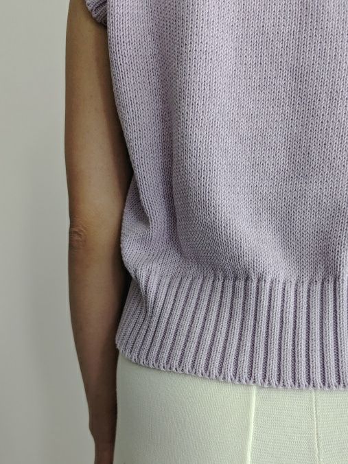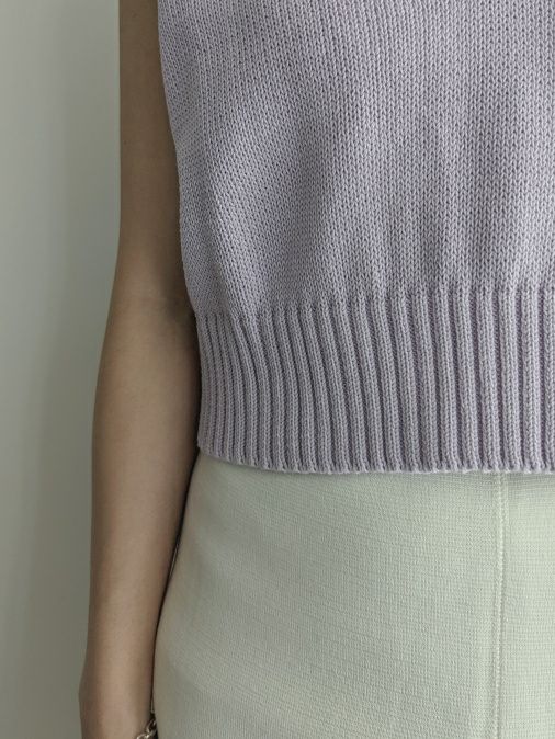 コットン100%、5ゲージで心地よいクロップド・フィット。春らしいラベンダー色のシンプルなデザインです。ネックや裾のリブなど、細部まで拘りが詰まった1着。