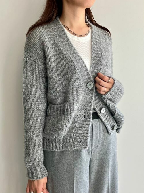 ふんわりした柔らかな編みのVネックカーディガンでシンプルなデザインですが、ネックや袖のリブなど、細部まで拘りが詰まった1着。身体がそよぐゆったりしたラインで、重たくなりがちな秋冬スタイリングのアクセントカラーとなりお薦めです。