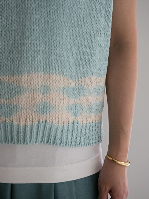 コンパクトで編み感とガーメントダイ(製品染め)の風合いがポイント。絞り染めで1点1点同じものがなく自分だけの1着になります。ボトムはワイドめのパンツやシャツワンピース、カットソーなどにレイヤードしてコーディネートの幅が広がります。
