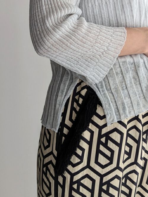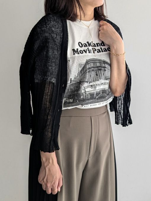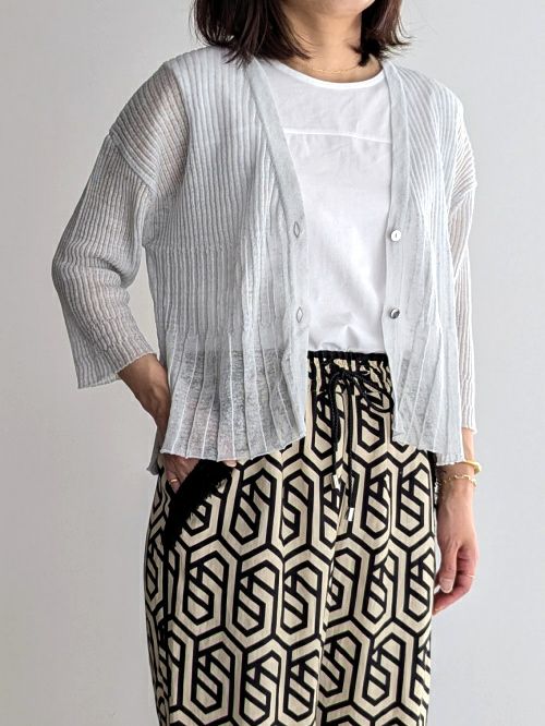 透け感のあるVネックのリブニットカーディガン。着丈が少しショートでサイドのスリットも女性らしさを演出してくれます。リネンの細い糸番手を使用し光沢と柔らかな透け感が初夏から夏の上品な羽織におすすめです。