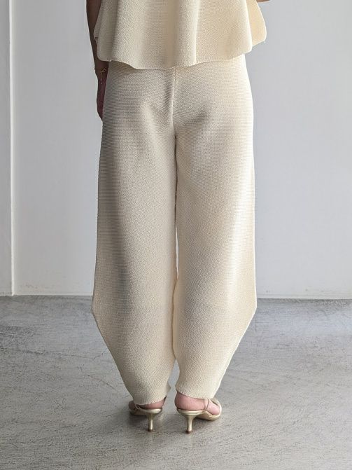 和紙素材混紡の涼やかな風合いが魅力のニットパンツ。ほどよくゆとりをもたせたバルーンシルエットが、裾にかけて自然に細く絞られ、リラックス感のあり洗練されたラインを演出します。肌にやさしい裏地付きで、心地よい履き心地。これからの季節にぴったりな、上品さと軽やかさを兼ね備えた一着です。