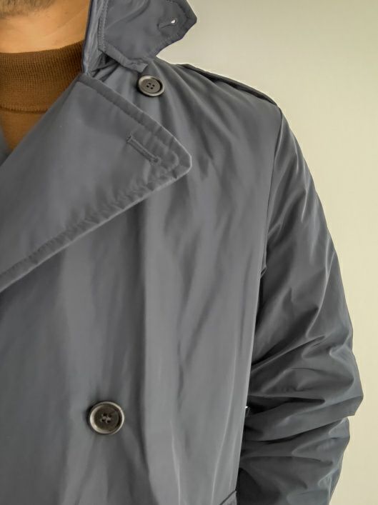 本格的なディテールに拘ったトレンチコート。光沢のあるポリエステルを生地に使用することでモダンな表情に仕上がっています。