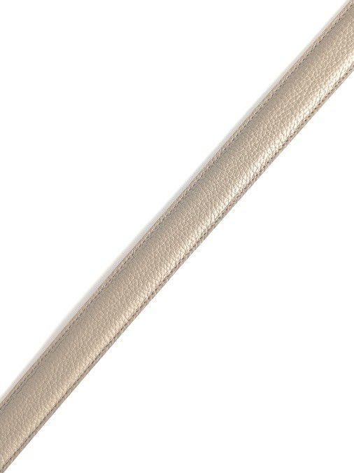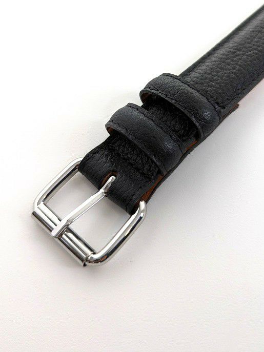 上質なシボ革の表情や、小ぶりで上品なバックルデザインが魅力的なベルト。