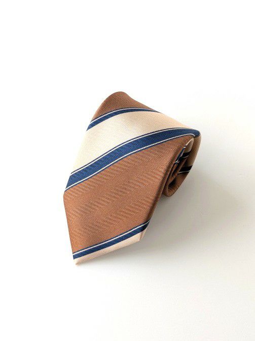 上質なシルク素材を使用したレジメンタルネクタイ。ピッチの異なるストライプがVゾーンに立体感を生み出してくれます。顔映りを明るくする上品な配色も魅力的な一本。