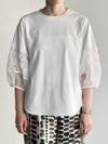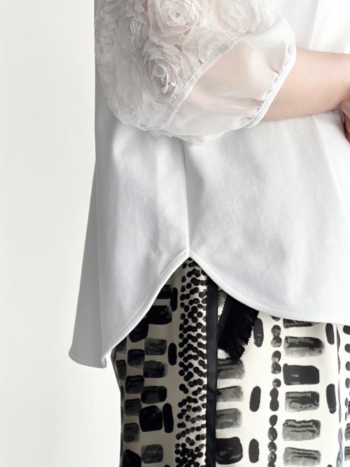 シアー感のあるオーガンジーとボリューム袖を軽やかに華やかに仕上げました。身頃は肌触りの良いきれいめなジャージー素材を使用。ブラウスのような気品とTシャツの快適さを兼ね備えた一枚です。