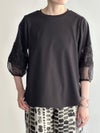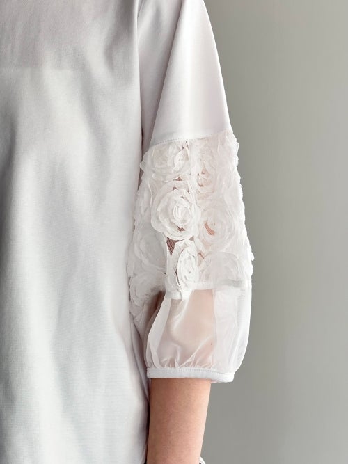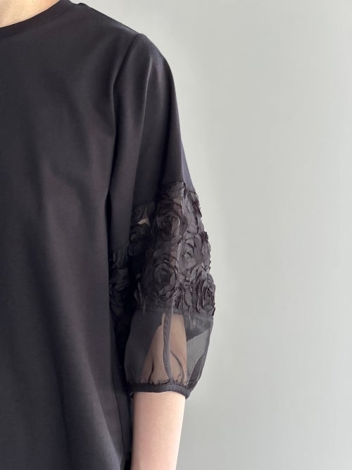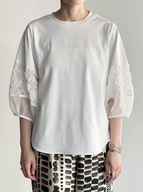 袖に施された立体的なフラワーモチーフのレースが目を引く主役級のカットソーです。