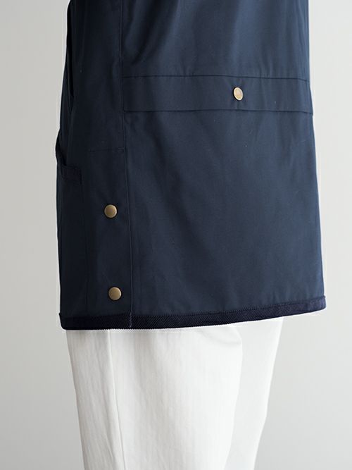 肩回りはラグランスリーブで可動域が広く、裾両サイドにはスナップ釦の脱着でスリットを作る事ができます。