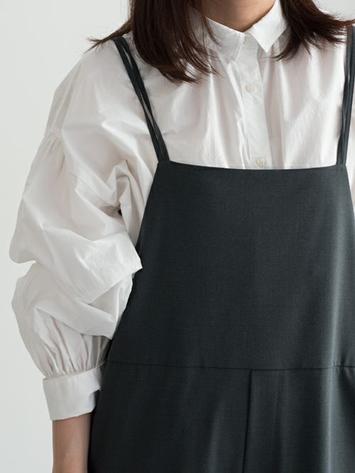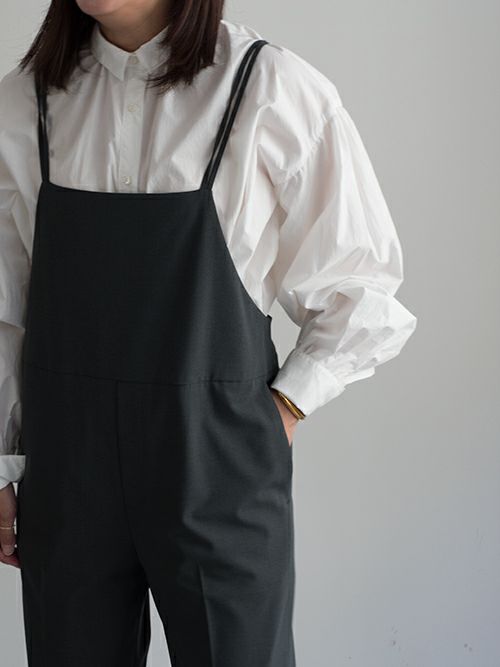 シンプルながらも美しい縦のラインを描き、大人の品を感じさせる一着に仕上げました。肩紐はさりげなく二重にデザインされ、甘くなりすぎず女性らしいニュアンスを演出。センタープレスが縦のラインを際立たせ、広がりやすいサロペット特有の印象をスッキリと引き締めてくれます。背中にはアジャスターを配し、着丈は好みに合わせて簡単に調整可能。トレンドに左右されず、洗練されたスタイルを楽しめる一着です。