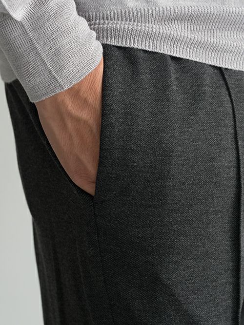 giabs archivioらしい、足が綺麗に見える細身のシルエットが魅力的なジャージーパンツ。フロントのクリースは縫製をしてあるので薄くなる事もありません。生地にはストレッチがしっかりきいており、リラックスした快適な着用感です。