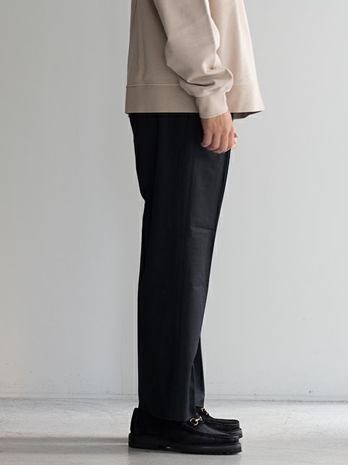 ゆとりのあるシルエットで、リラックス感のあるイージーパンツ。ノータックですが、比較的股上が深いデザインでヒップには余裕を持たせています。