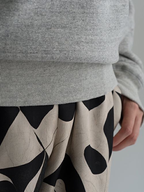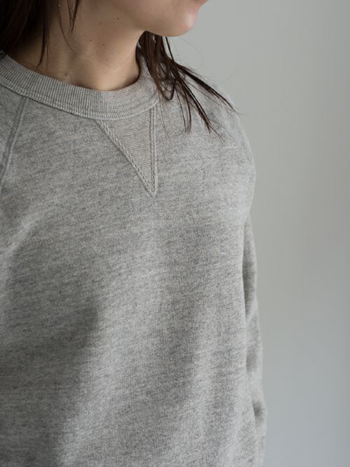 Kepaniの代表的モデル、ブランド誕生時より展開しているモデルでもありラフィー糸は、超長面綿と落ち綿を混ぜて作られ、ムラ感と柔らかさを持たせて、旧式編み機で緩めに編み、保湿性と肌触りを重視。洗ってもしなやかさを失わず、形が戻る再形成性が高いです。クルーネックの前後両方にV字ガゼットを配置し、ヴィンテージスエットの意匠を取り入れており、肩はラグランスリーブで動きやすく、リブがしっかりしており伸縮性が高いです。シルエットは程よくフィットしつつ締め付け感はなく使いやすい定番スエットです。