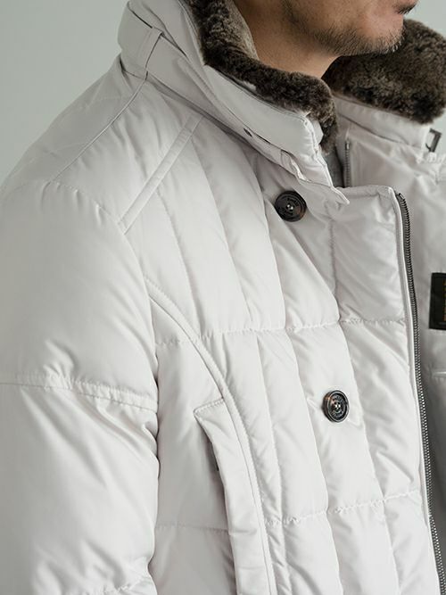 シワになりにくく撥水加工も施した生地、内側に配したドローコードやダブルジップ仕様など、機能面も非常に優れており、襟元のムートンファーがより一層の高級感を演出します。