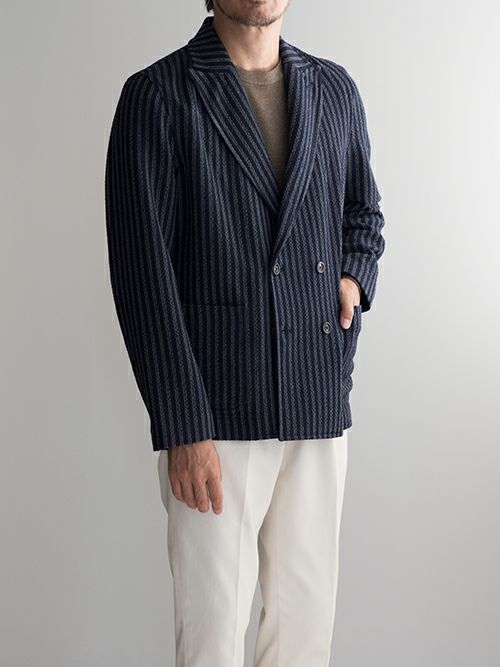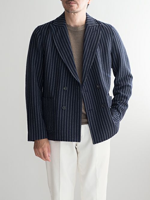 ウールナイロン混のダブルブレストジャケット。裏地なしの軽やかな着心地が魅力的です。