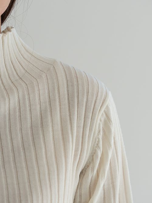 肌触りのいい細番手のスーパーファインメリノウール系を100%使用。メリノウールは保温性、防臭力、に優れており通気性が良く、なめらかな肌触りが特徴の羊毛です。インナーとしても一枚着としても使えるハイゲージニット。袖口を二重にすることで一枚でレイヤードの要素をデザインした一枚。少し長めの袖丈と着丈、細身に言えるように設定したBODYのバランス、直接肌に触れる為上質な素材を、などシンプルだからこそ拘りを詰め込んだ一着です。