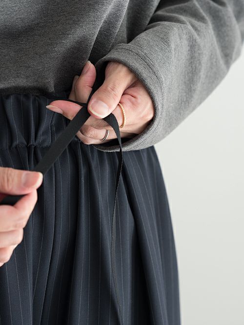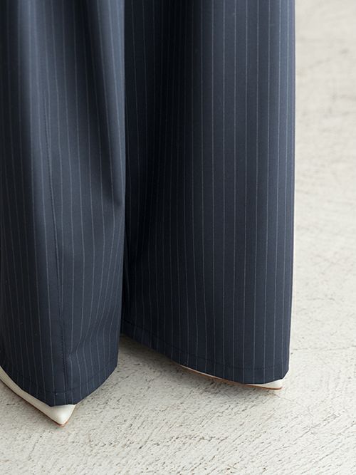 ゆったりとしたシルエットのワイドパンツです。ウエストはゴムになっており、リラックスして着用できるイージーパンツタイプです。生地にはピンストライプがあしらわれており、カジュアルになりすぎず、きれいめな印象を与えます。