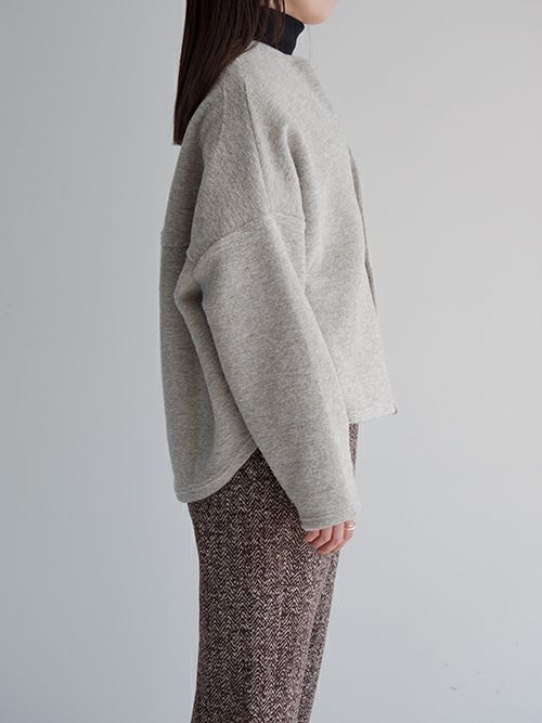 ミドルゲージで程よく目が詰まった編み地は、軽やかで柔らかく、そして心地よい暖かさを感じられる上質な素材。イタリア製ファブリックならではの美しい杢調の無地に、さりげなく織り込まれたゴールドラメが上品なきらめきを添えます。少し後ろに抜けるようなリラックス感のあるシルエットが魅力。後ろ身頃やアームまわりにたっぷりとしたボリュームを持たせることで、動きのある立体感とこなれた雰囲気を演出してくれます。