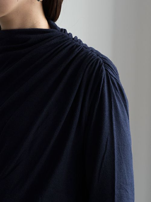静かな個性が光る1枚ネックから肩にかけてアシンメトリーに寄せられた繊細なギャザーデザインが、柔らかな立体感を生み出します。片側に施されたボトルネックが、シンプルな中にモードなニュアンスを添えて。ハンドメイドならではの温かみと丁寧な仕立てが感じられる一着です。コットンとレーヨンをブレンドしたカットソー素材は、しっとりとした肌触りと程よい伸縮性で、快適な着心地を叶えます。日常に溶け込みながらも、さりげなくスタイルを引き立ててくれる、大人のためのベーシックアイテムです。