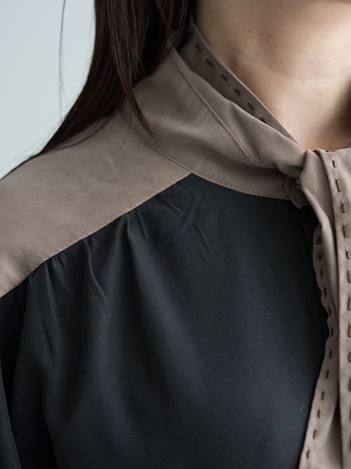 上品なバイカラーが雰囲気良く、一枚で様になるスタイリングが完成します。シンプルなアクセサリーで華やかさをプラスするのもお薦め。生地は薄手なので、秋冬はインナーを入れてレイヤードスタイリングを楽しむこともできます。