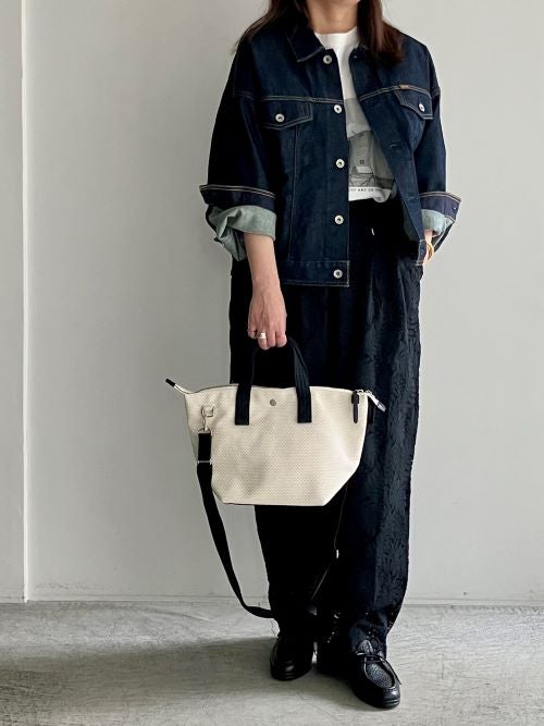「4LM2CC002L」を合わせたセットアップスタイルは、今季らしいエフォートレスなムードを演出します。インナーにはあえてカジュアルなプリントTシャツやタンクトップを差し込み、気負わない「崩し」を加えるのもおすすめです。
