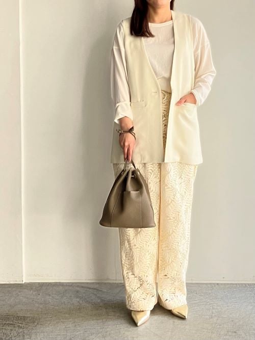 ボタニカルなリーフ柄を立体的に表現した表情豊かなカットジャカードパンツです。繊細なレースのような透け感と凹凸感のあるテクスチャーがワントーンながらも圧倒的な存在感を放ちます。