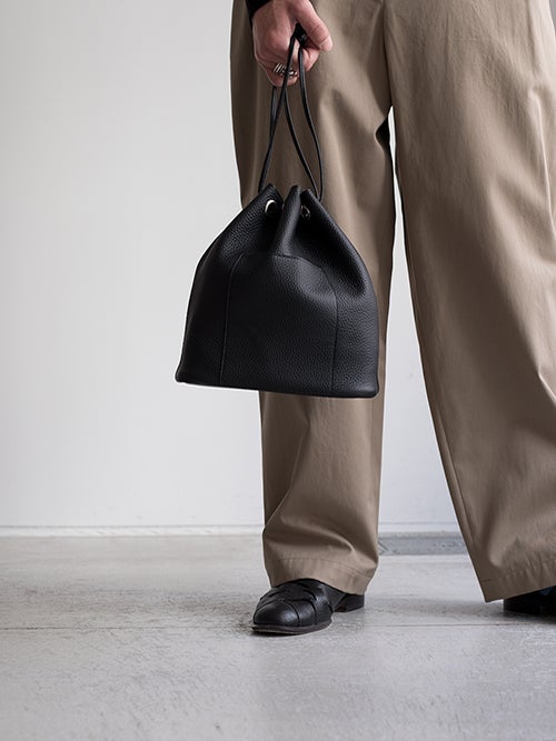 やや大きめのサイズ感が嬉しい巾着バッグ。長財布、携帯、サングラス、小さなポーチぐらいなら問題なく収納できます。