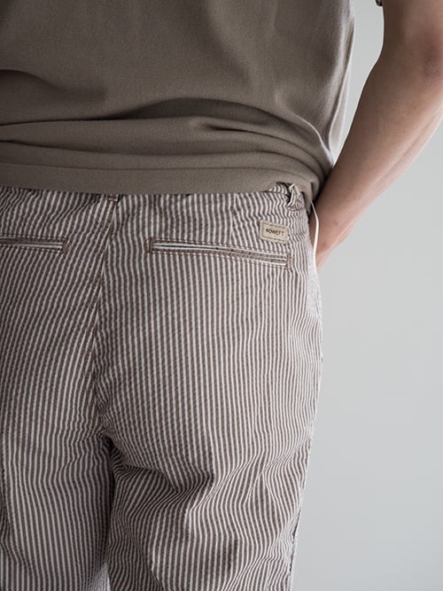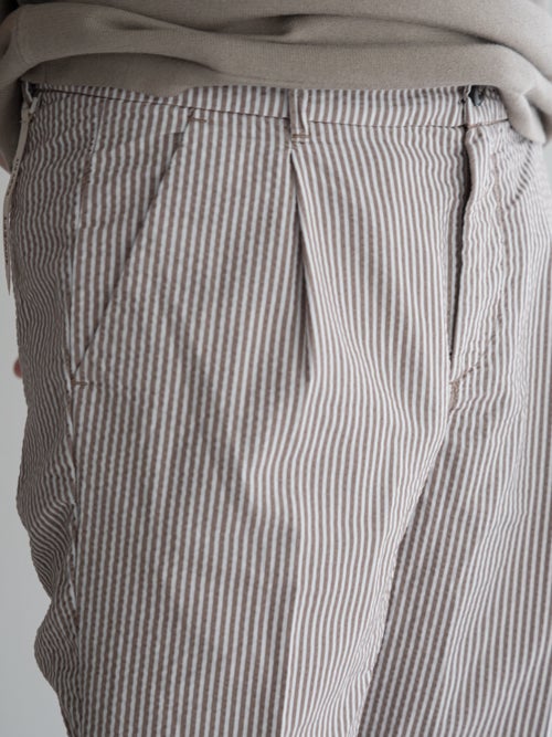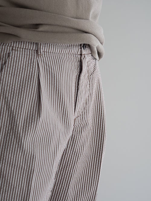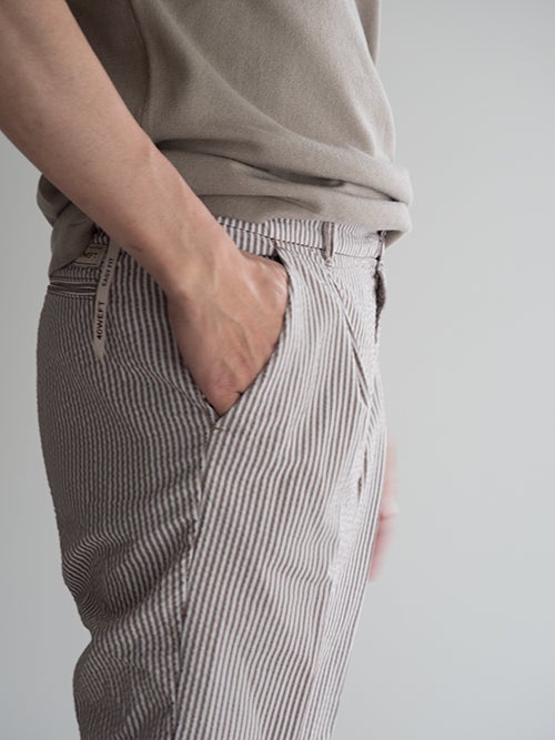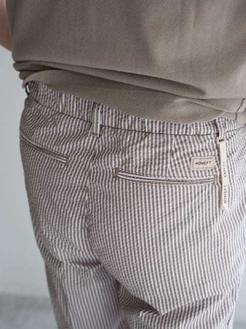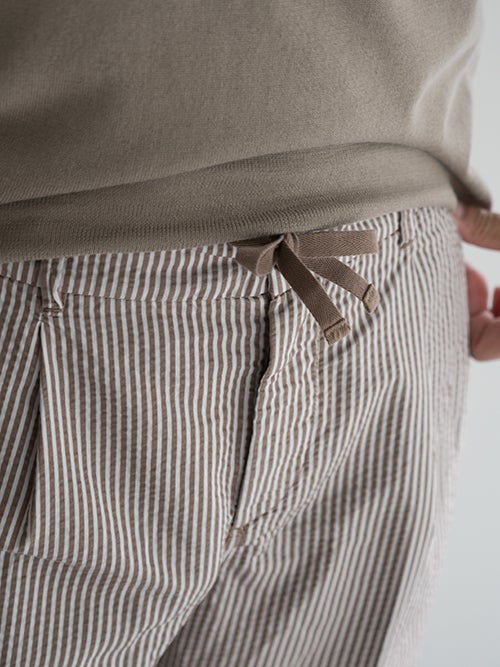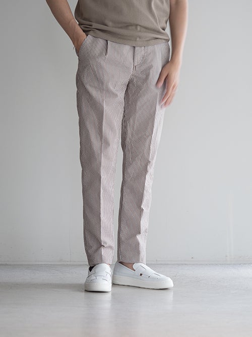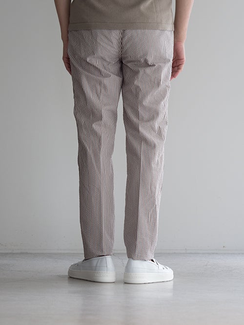 サラッとした肌触りのシアサッカー生地で、春夏シーズンに適したテーパードパンツ。アクセントになる軽やかなストライプ柄が魅力です。