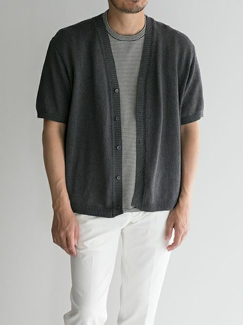 和紙を使用した珍しい素材のショートスリーブカーディガン。肌触りはドライタッチで、着心地も軽やかな一着です。和紙が持つ独特のザラッとした風合いも魅力的。