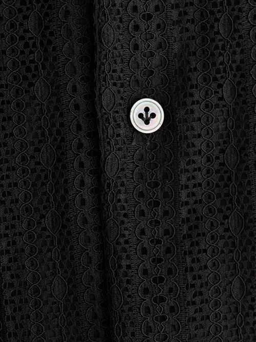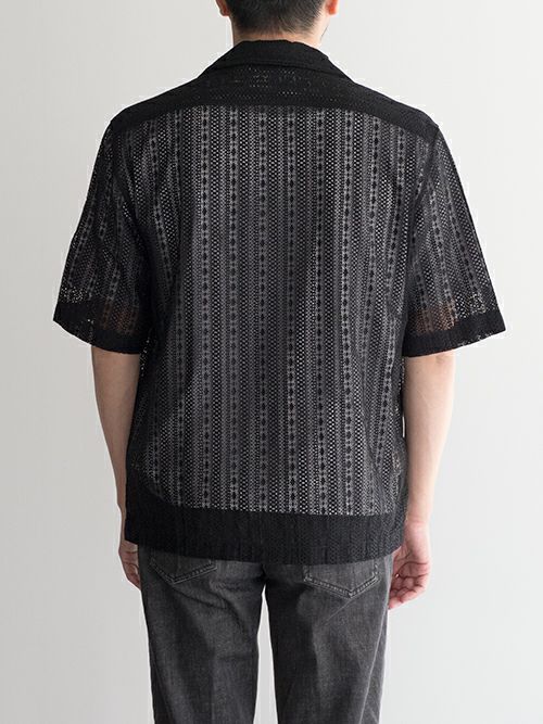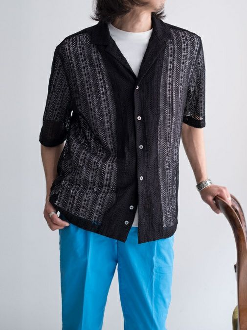 オープンカラーのメッシュ編みシャツ。トレンド感だけでなく、色気と上品さも併せ持つ一着です。
