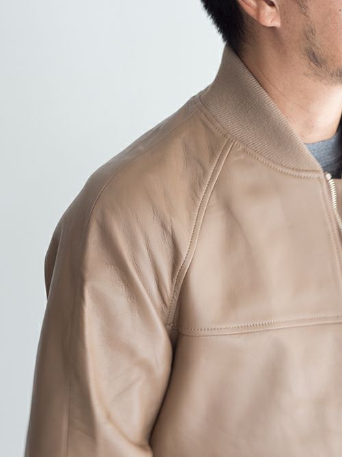 ラグラン仕様の肩回りは可動域が広く、まさに肩肘張らない大人のレザーブルゾンと言えます。それでいて野暮ったさは皆無の美しいシルエットとゴールドのダブルジップが高級感と上品さを漂わせる一着。