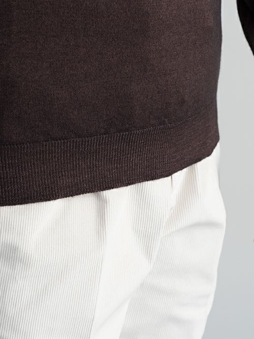 柔らかな肌触りと温かな着用感で、タイト過ぎず緩すぎず、絶妙なシルエットが魅力的な一着。