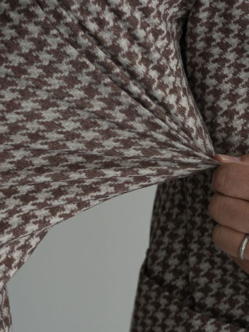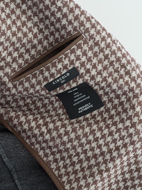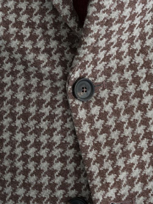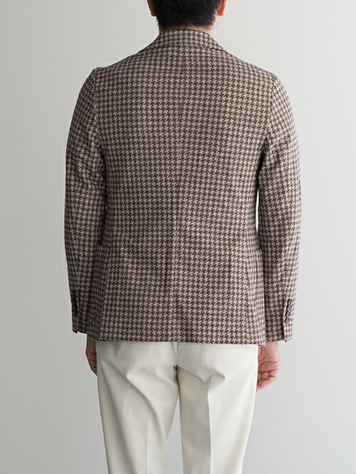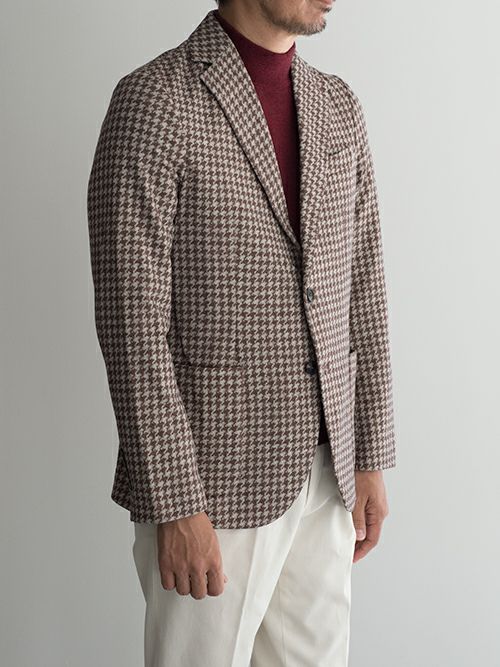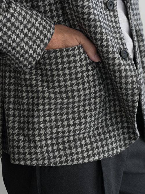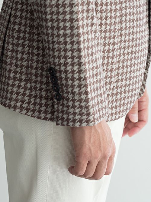 カットソーやニットの上に気軽に羽織れるハウンドトゥース柄ジャケット。もちろんタイドアップも可能な、オンオフ活躍する万能アイテムです。