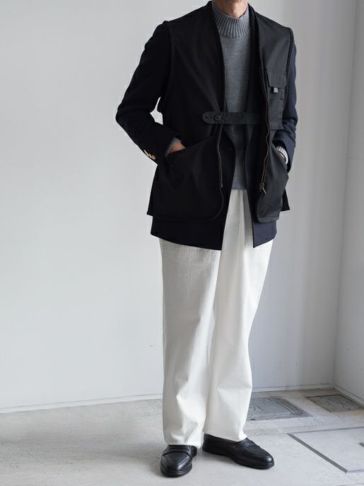 デニムやチノなどのカジュアルパンツは勿論、 グレーのウールスラックスにもしっかり対応してくれる秀逸なジャケットです。