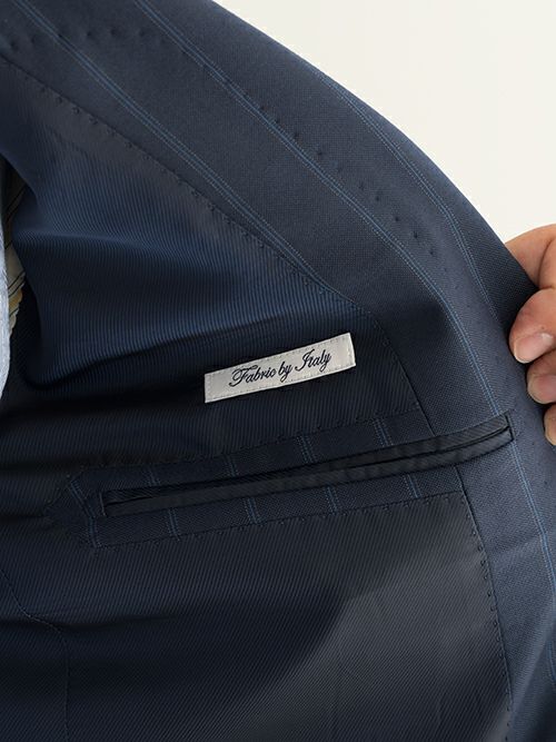 イタリア生地を使用した秋冬スーツ。ジャケットはノッチドラペル、フラップポケットで3つボタンの段返り仕様。毛芯には本バス毛芯(馬の尾毛)を使用し、衿元から胸にかけてハリを与え立体的なシルエットをになります。毛芯の中でも最高峰の物を使用しております。