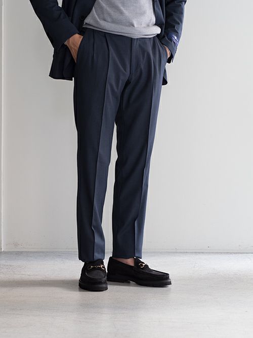 ノッチドラペル3つボタンの段返り、ポケットはバルカパッチ仕様。サイドベンツで一枚芯の軽快なジャケットに仕上げています。パンツは2タックのテーパードシルエット。ウエストはドローコードとベルトループの2WAY仕様。
