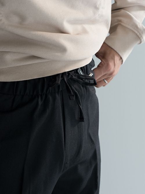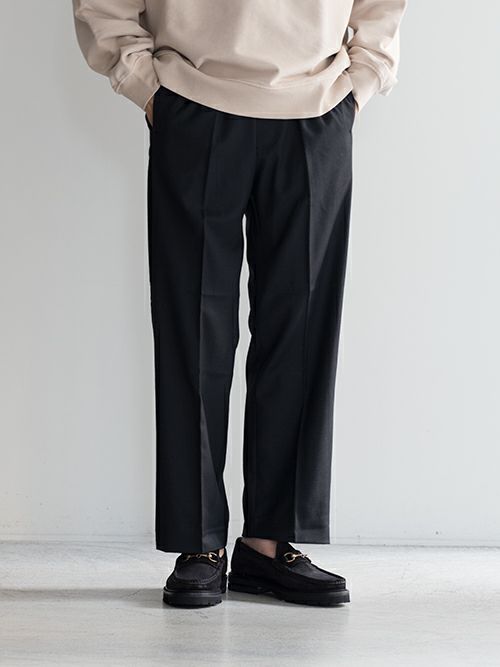 ゆとりのあるシルエットで、リラックス感のあるイージーパンツ。ノータックですが、比較的股上が深いデザインでヒップには余裕を持たせています。