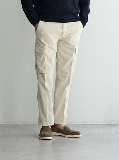 秋冬らしいコーデュロイ生地で、いわゆるドレスカーゴと言われるモデル「AIKO」。ノータックで股上も比較的浅く、全体的に細めのテーパードシルエットです。